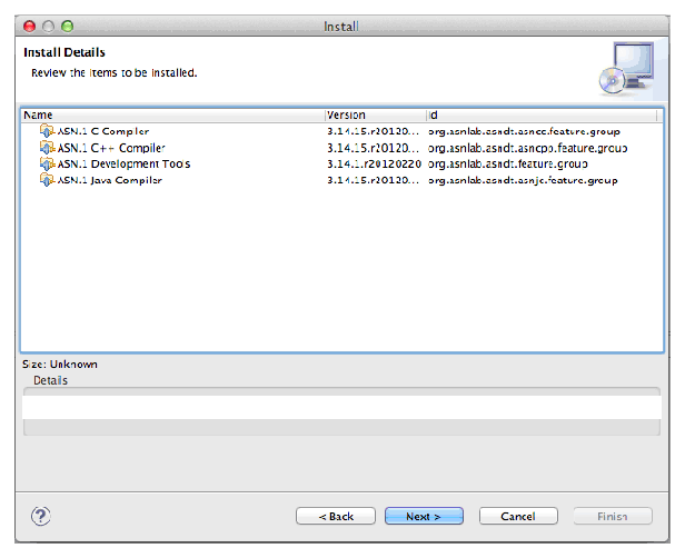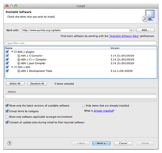Select the checkbox next to "ASN.1 Development Tools" under "ASN.1 SDK" category, and select any of the ASN.1 compilers and other ASN.1 tools under "ASN.1 plugins" category. Click Next.